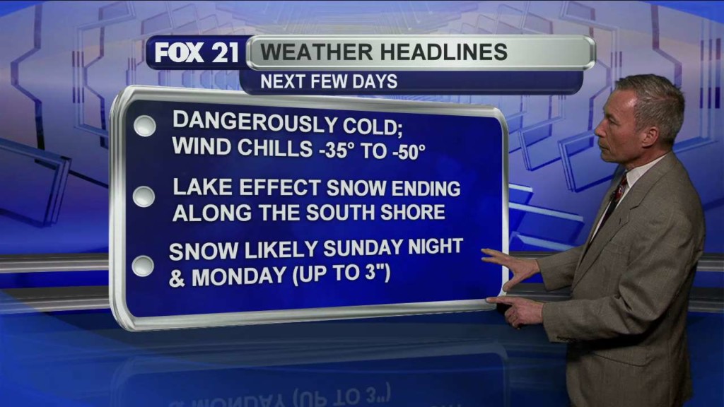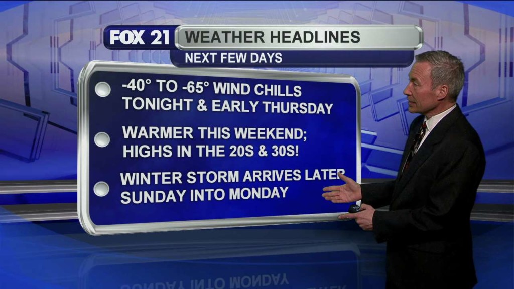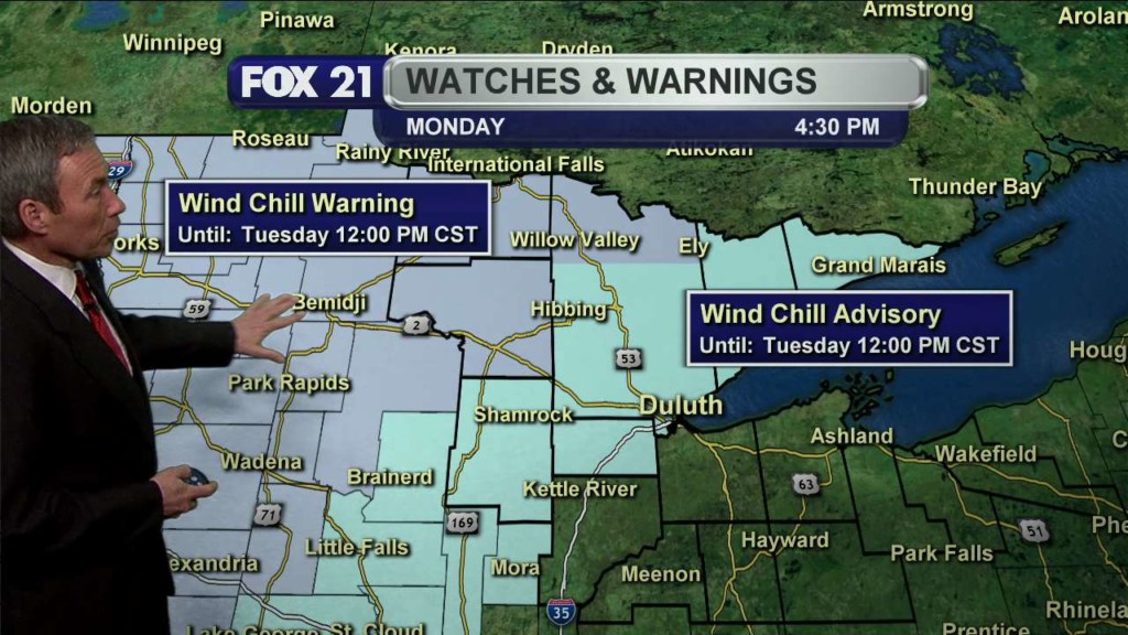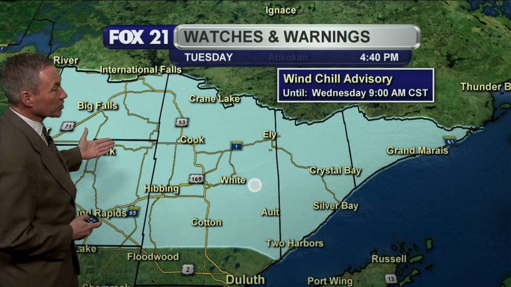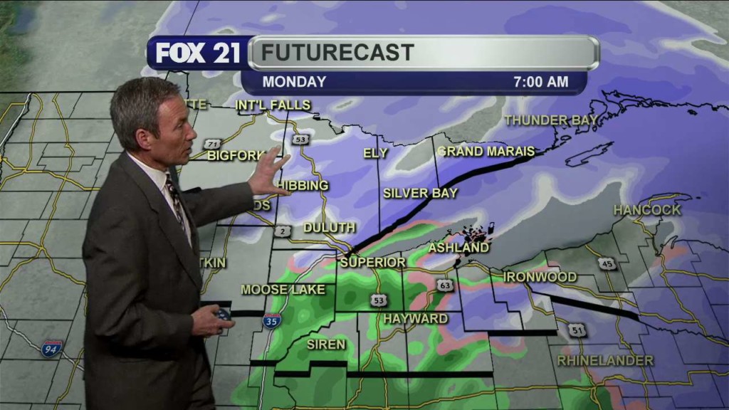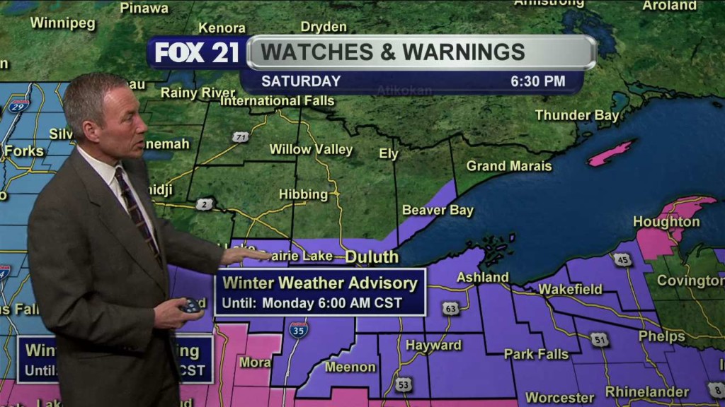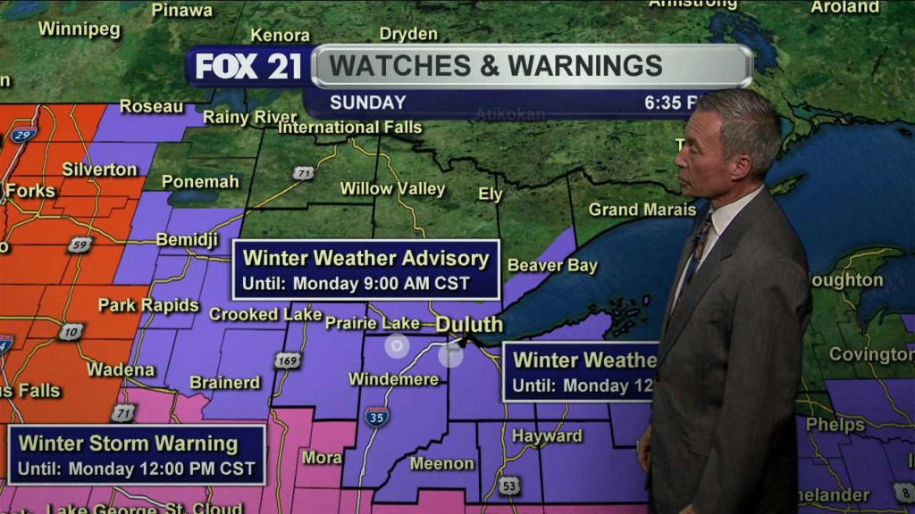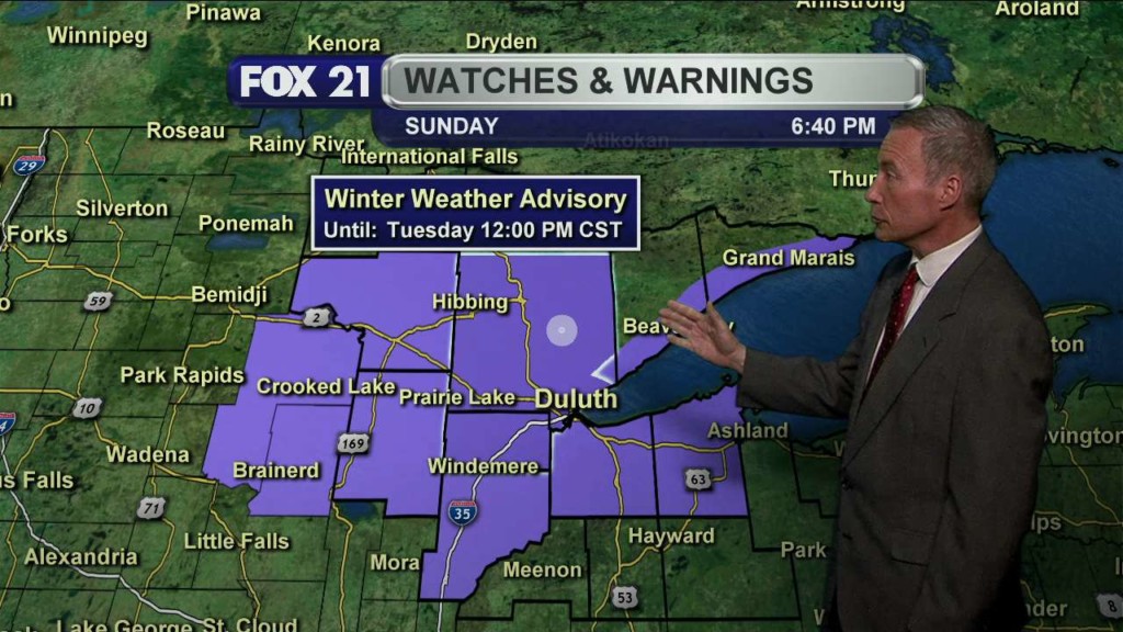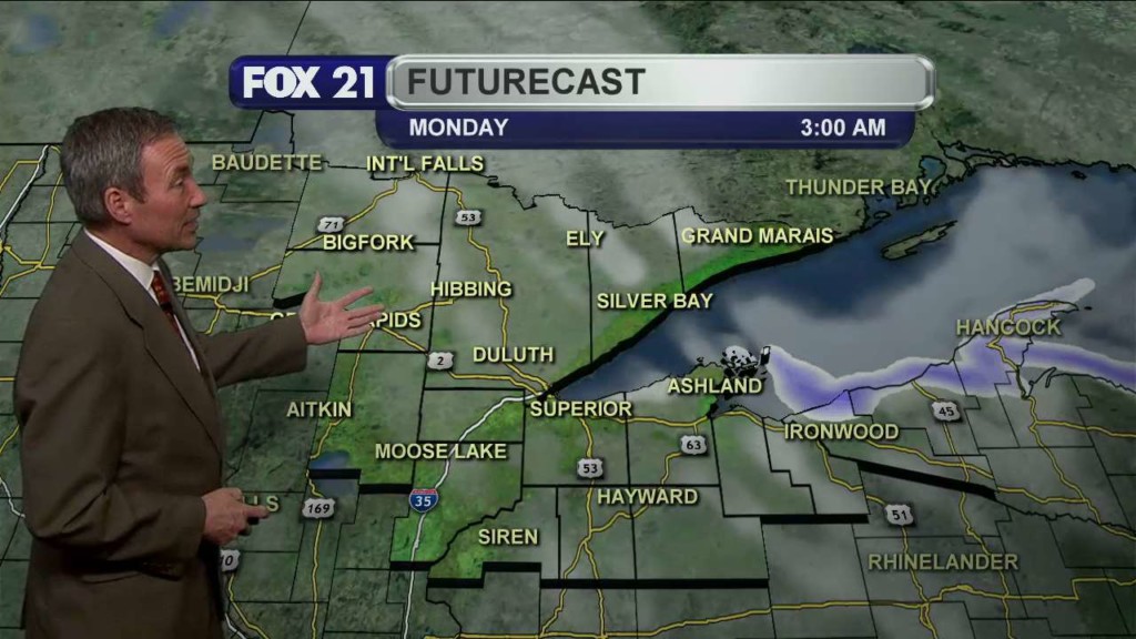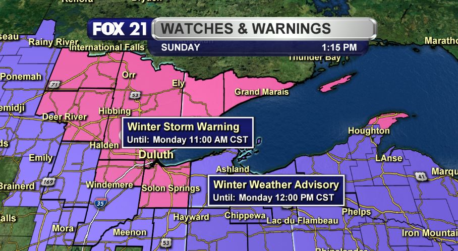 DULUTH, Minn. – After a quiet, mild weekend, our next winter storm moves into the Northland Sunday night and Monday. A “Winter Storm Warning” goes into effect Sunday evening into late Monday morning for Carlton, Itasca, Koochiching and St. Louis counties in Minnesota and for Douglas County, Wisconsin. A “Winter Storm Warning” runs Sunday evening and runs through early Monday…