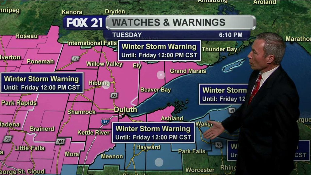 The much advertised first major widespread winter storm of the season is bringing heavy snow and a wintry mix to the Northland. A “Winter Storm Warning” remains in effect through Friday morning for all of northern Minnesota and until noon Friday for Bayfield and Douglas counties in Wisconsin. Also, in Wisconsin, a “Winter Weather Advisory” remains in effect through 9…