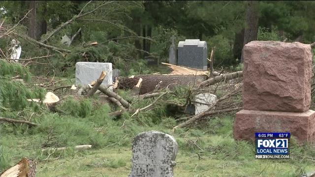 Just a couple miles outside of Biwabik, the Lakeside Cemetery had hundreds of trees and tombstones damaged by the storm.