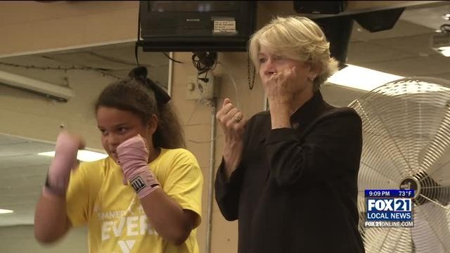 Senator Janet Bewley visits YMCA, meets local boxer.
