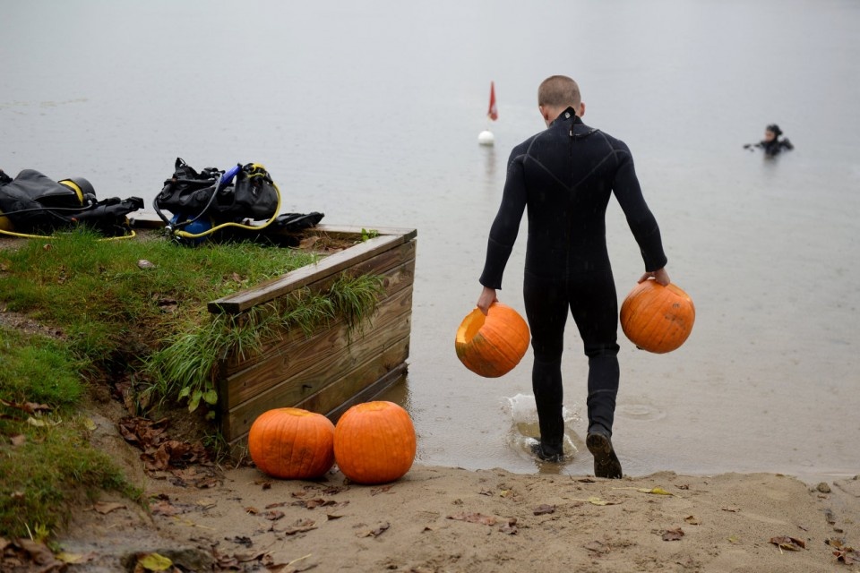 A group of scuba divers donned flippers and wet suits to carve pumpkins underwater as part of a pre-Halloween tradition in Michigan.