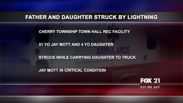 A Virginia man remained in critical condition Monday after being struck by lightning at the Cherry Township Town Hall Recreational Facility.