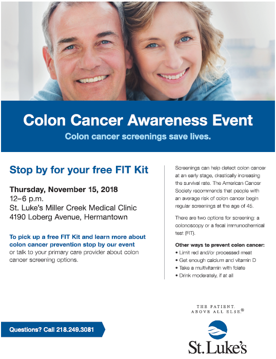 DULUTH, Minn. – St. Luke’s Miller Creek Medical Clinic is hosting an event to raise awareness of the importance of being screened for colon cancer. St. Luke’s will be giving away free fecal immunochemical tests or FIT Kits on Thursday, November 15. Along with the kits, health experts will be on hand to offer advice and educational materials on colon…