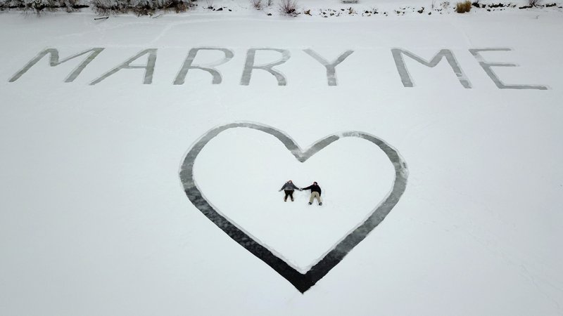 ‘Marry Me’ etched in snow, seen from above.