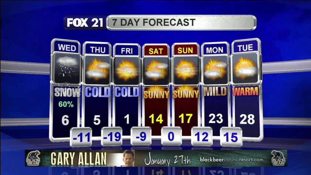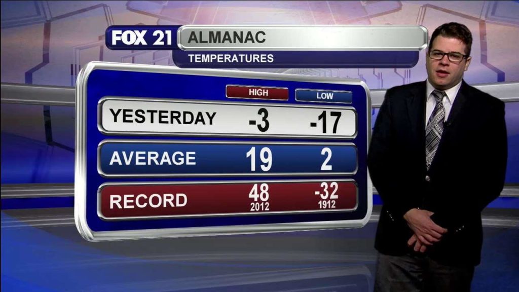 IT WILL BE WINDY ON TONIGHT WITH WINDS ANY WHERE BETWEEN 25–35 MPH. OVER NIGHT LOWS WILL DROP INTO THE SINGLE DIGITS TONIGHT AND REMAIN CHILLY THE REST OF THE DAY. TEMPS REBOUND WEDNESDAY REACHING THE LOWER 30’S AND GET BACK TO NORMAL THE REST OF THE WEEK. OUR NEXT DECENT CHANCE OF SNOW WILL BE THURSDAY NIGHT INTO FRIDAY….