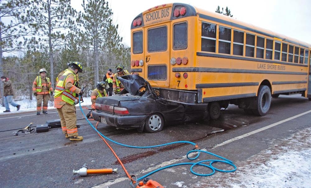 The driver who slammed into a school bus near Ashland is improving at a Duluth hospital.