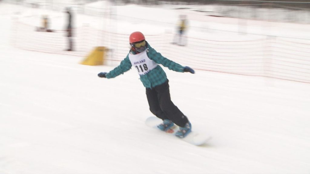 Local kids hit the slopes to compete in a ski and snowboard meet at Mt. Ashwabay Monday.
