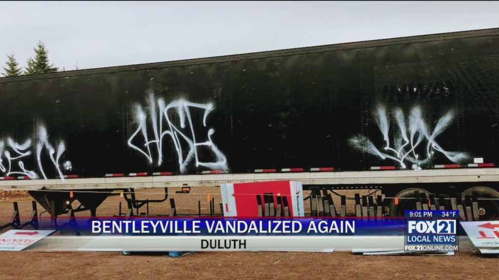 DULUTH, Minn.- Duluth Police are investigating vandalism at Bentleyville Tour of Lights in Bayfront Park. One of the trailers was spray painted over the weekend with graffiti. And after theft and vandalism last year, too, Bentleyville’s founder is asking for extra eyes to help patrol the Northland’s biggest festival of lights. Unfortunately the Grinch has struck again at Bentleyville, as…